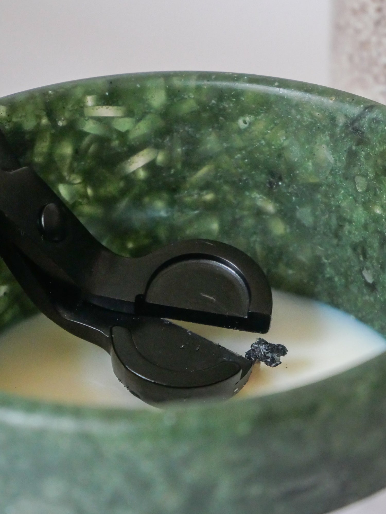 La mèche de votre bougie joue un rôle central dans la combustion et la qualité de la flamme. Après chaque utilisation, coupez la mèche à environ 5 mm à l’aide d’un coupe-mèche pour bougie, cela garantit une flamme droite, propre et stable en évitant les résidus et la suie. Une mèche trop longue ou penchée peut tremper dans la cire ou produire une fumée noire.